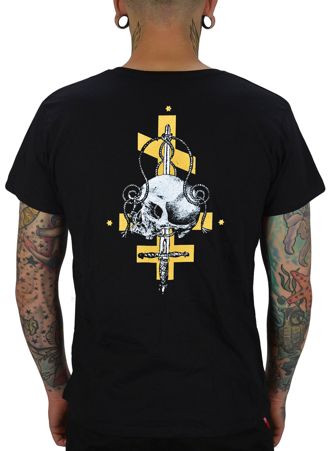 This Batushka T-shirt has a front print depicting a mourning figure in a red cloak, surrounded by daggers and golden details. At the same time, the dripping color effect creates a raw and dramatic expression. On the back there is a stylish but powerful motif with a skull, sword and cross. Therefore, you get a T-shirt that is visually strong from all angles.