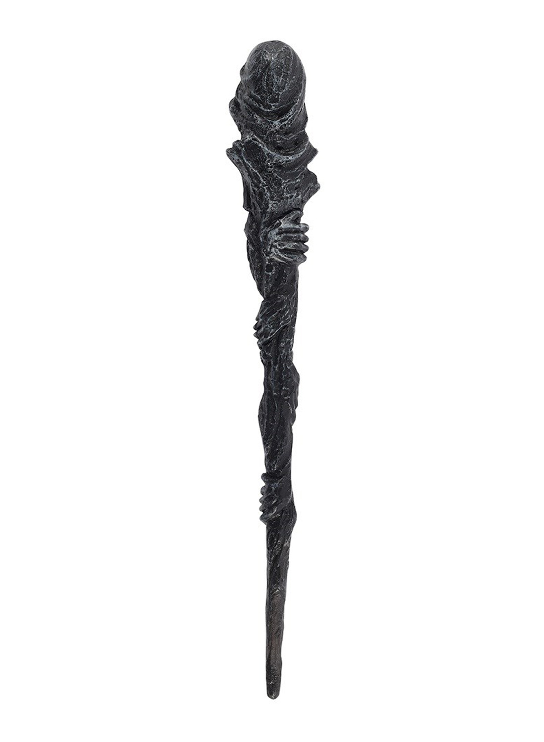 En trollstav för de mörka häxorna och trollkarlarna, den här speciella stilen har en klädd grim skördarfigur, genomträngande röda monsterögon och vassa klor som greppar en vridande, gjuten gren. Med en längd på 24 cm är den här staven den perfekta storleken för trollformler. Hanteras varsamt.