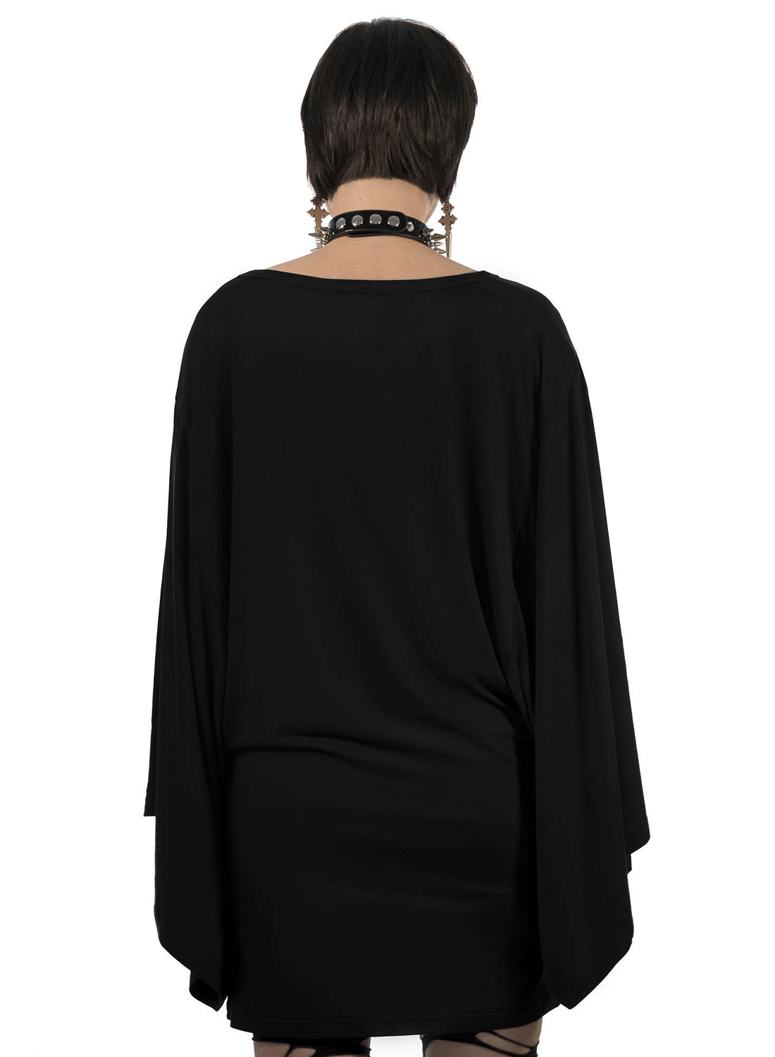 Lång och mjuk stretchjersey med långa och breda ärmar, bred halslinje och tryck framtill.
