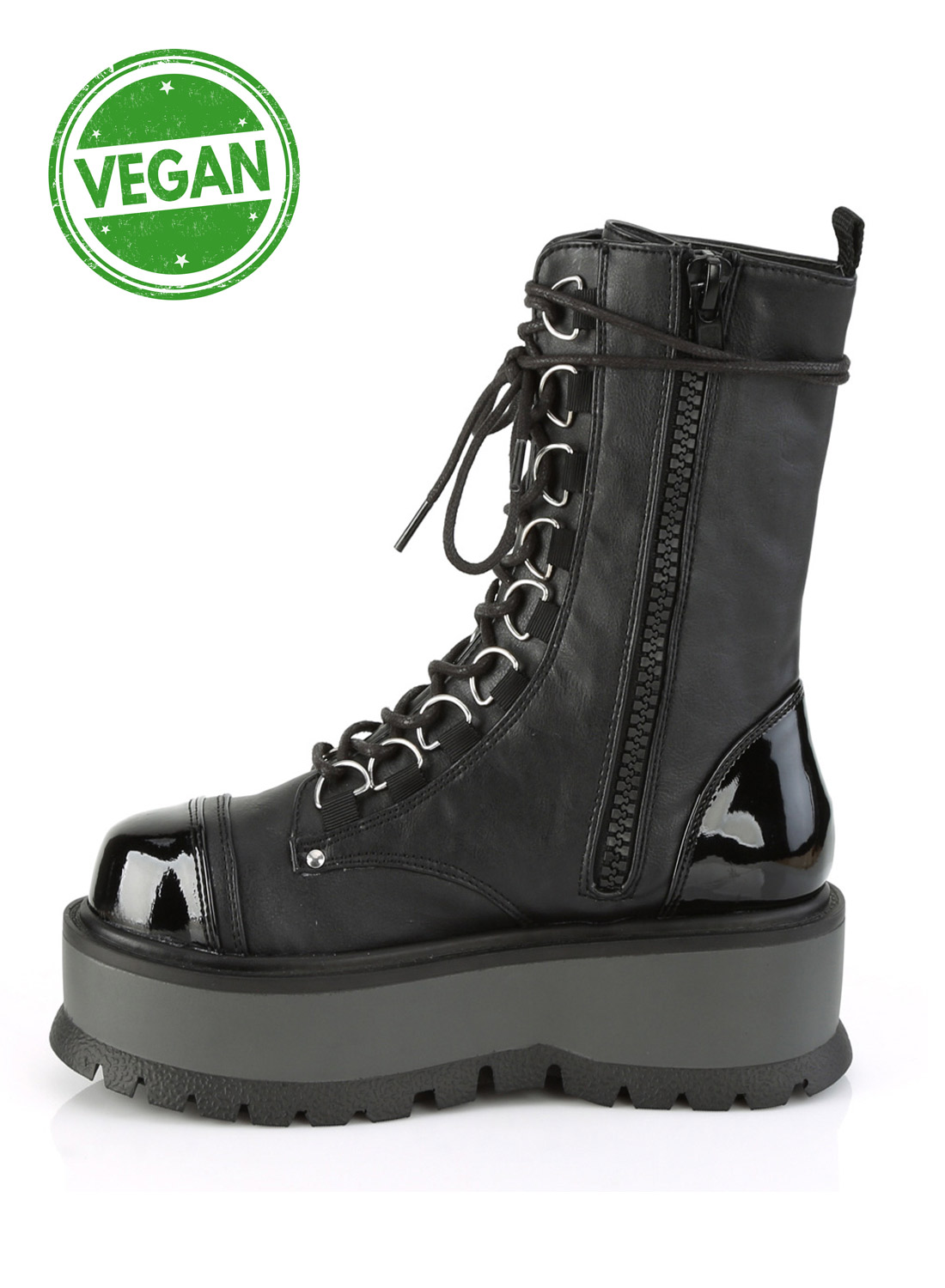 Demonia Slacker-150 är vegan boots från Demonia. 5,1 cm plattform. D-ring snörning fram mid-hög stövel, inre sidodragkedja. Blandad med matt och lack vegan läder.