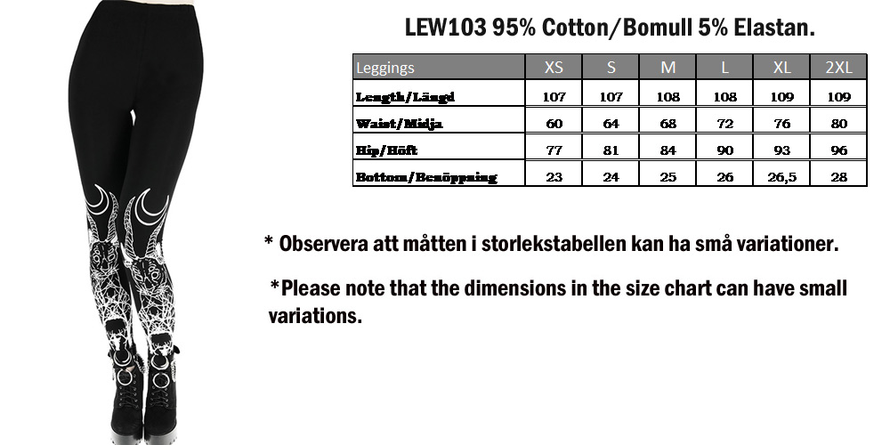 Leggingsen är höga i midjan med resår. Gillar du att squatta, och har du mycket muskler i benen rekommenderar vi en storlek större än du brukar ha i vanliga kläder.