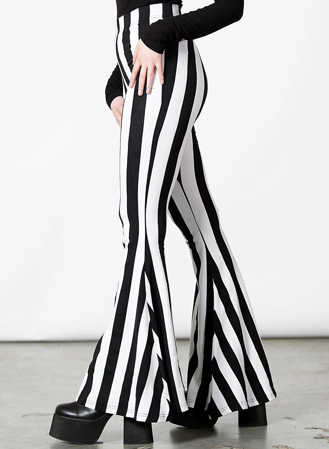Inferno Room Flares är stretchiga randiga punk, rock, glam, gotiska utsvängda leggings från Killstar.