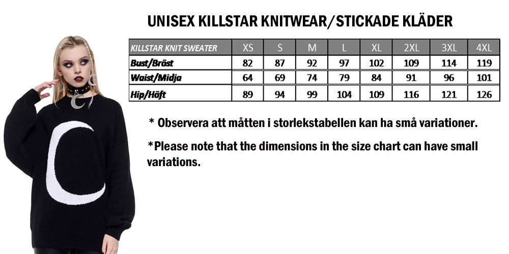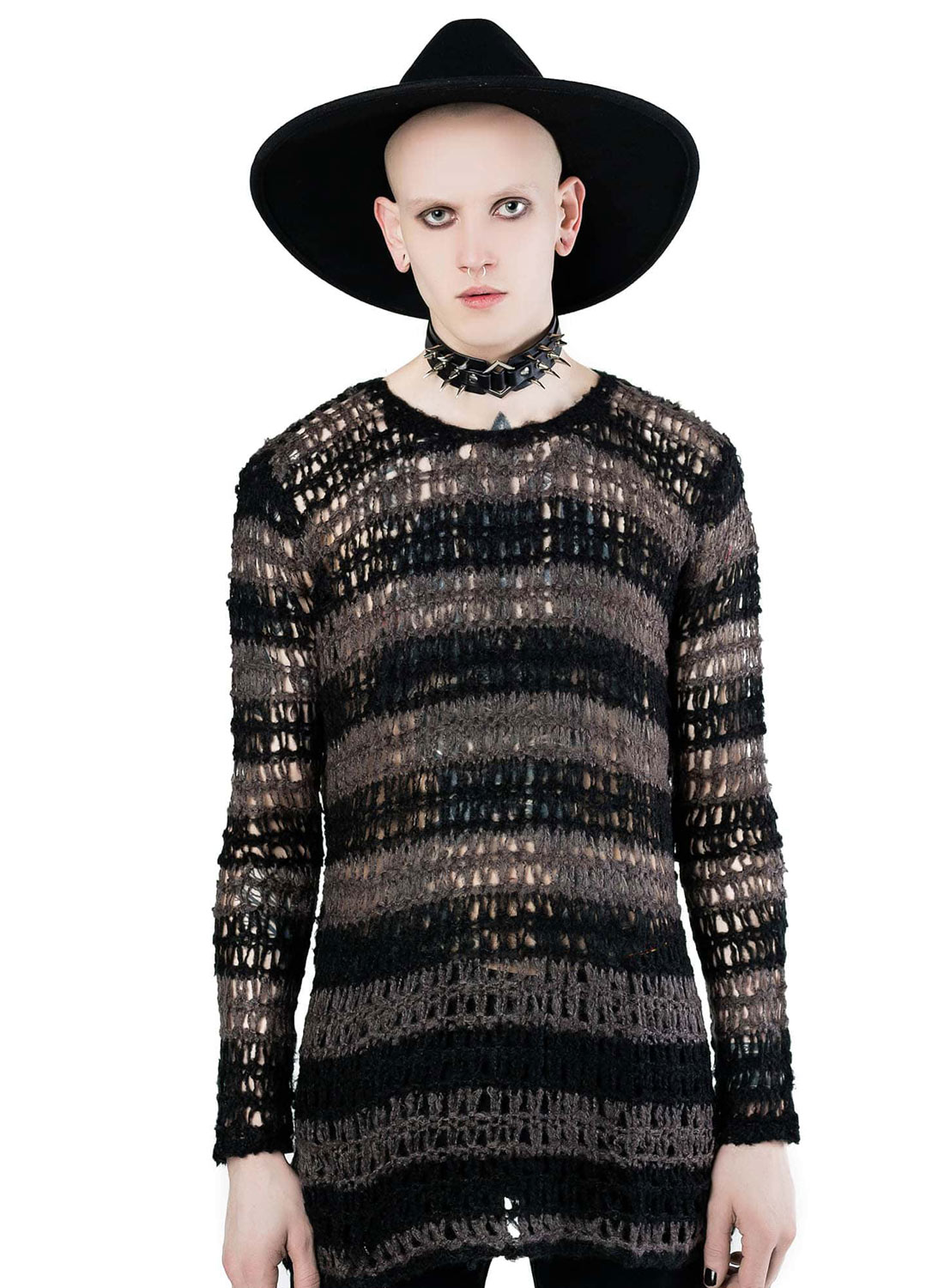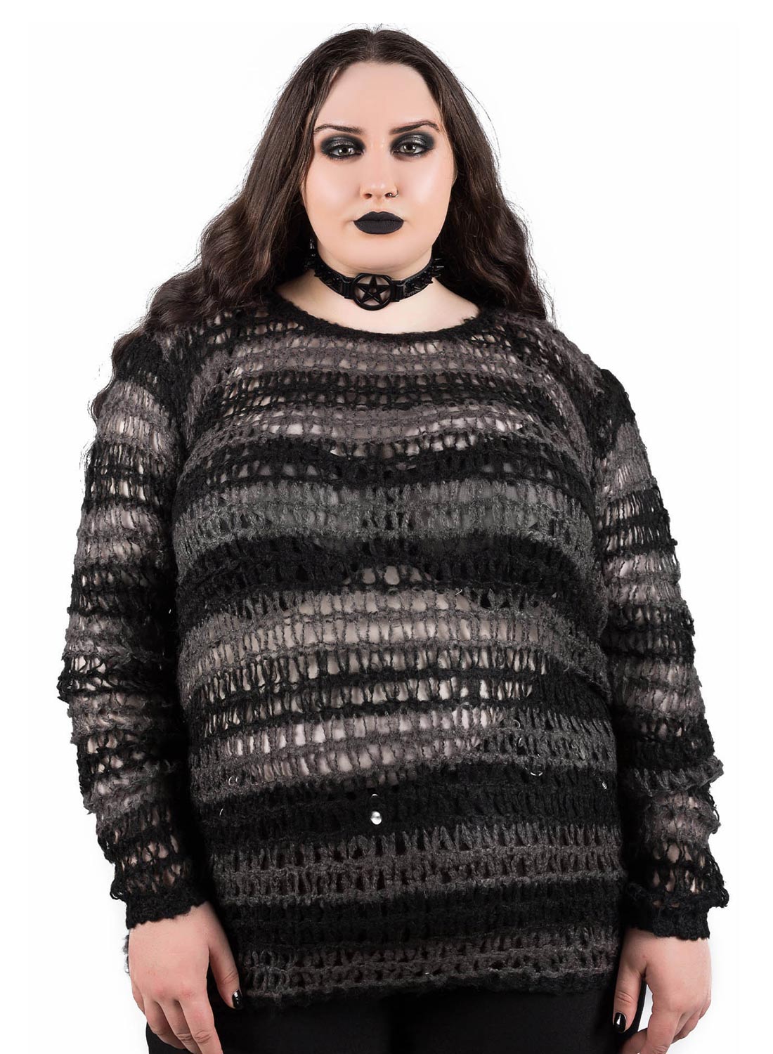 Strange daze Faux-Mohair tröja från Killstar. 90 tals grunge inspererad mjukstickad tröja, perfekt för vardagar. Svat och grå randig tröja med extra lång längd så att den enkelt kan kläs upp eller ner. Med nöddetaljer och låg halsringning. Perfekt för festivaler, midnattspromenader med månen och baksmälla söndagar.