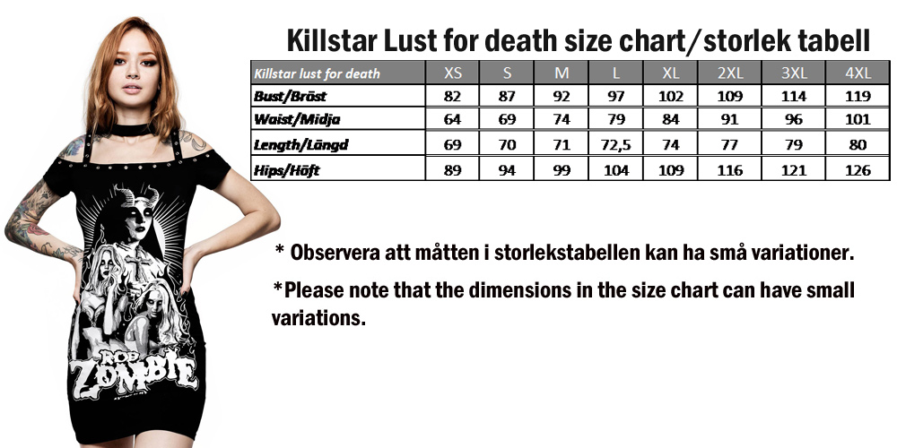 Killstar Lust For Death, klänning. Mjukt stretchigt tyg med bardotringning, choker- och accentband med öljetter – Rob Zombie-tryck framtill. Dold dragkedja baktill för att enkelt ta av och på.