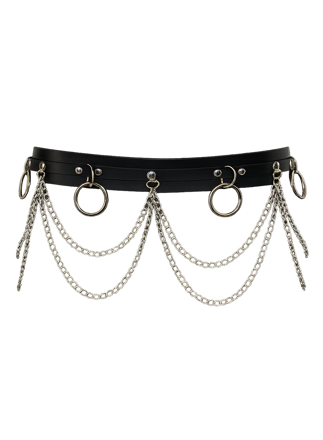 Metal Side Chain Belt is a stylish and rebellious waist belt inspired by Gothic Rock,punk and alternative streetwear. The design combines black faux leather with decorative metal rings and multiple layers of dangling silver chains. The result is an accessory that gives your outfit a clear attitude and a unique character.