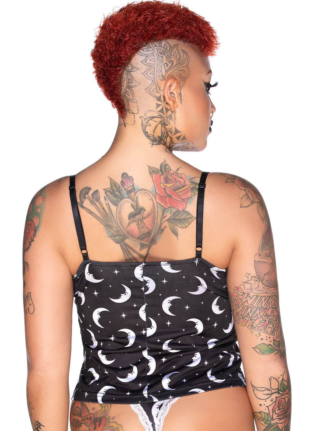 Känn magi när du suger på skräckfilmer i vår “Mystic” cami-topp. Tillverkad av ett stretchigt mjukt material och med ett kontrastgrafiskt tryck på framsidan, känsliga spetskanter och cami-remmar. Det är det perfekta plagget för övernattningar och filmmaraton.