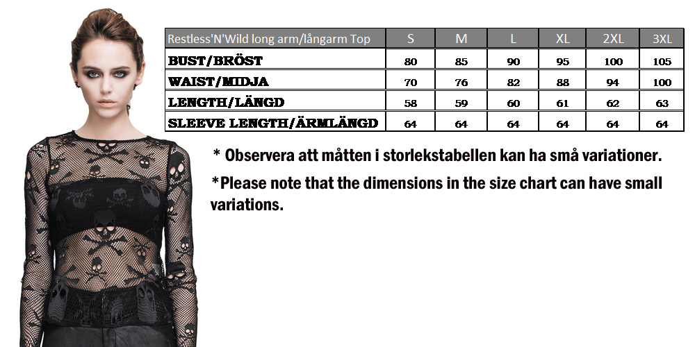 Skeletor Fishnet Top är en välsittande topp i kvalitativt nät från Restless ‘N’ Wild, tillverkat av stretchigt mjuk nylon. Bred, rundad linning och långa ärmar med döskallar over hela toppen.