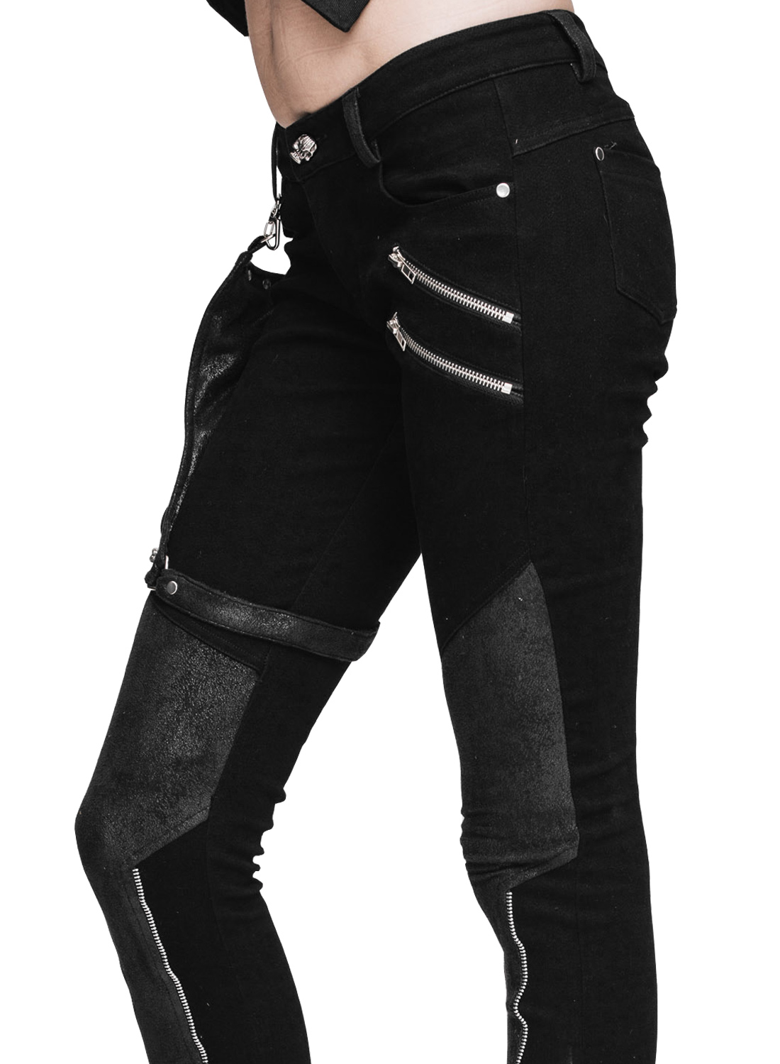 Praktiska och snygga byxor i punkrockstil med inlägg i konstläderlook och dekorativa dragkedjor på ben och höfter. Två framfickor och en bakficka ger plats för dina småsaker, och den fantastiska avtagbara benfickan/ väskan i konstläderlook ger extra förvaringsutrymme – så att du garanterat har händerna fria medan du dansar! Väskan är dekorerad med nitar och silverringar, vilket också gör den till en visuell höjdpunkt.